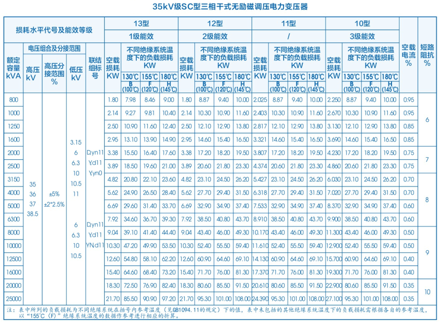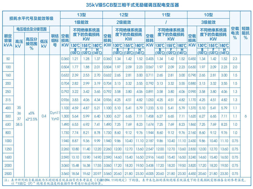 电压等级35kV,变压器容量30~20000kVA,该变压器是我公司在消化吸收引进技术的基础上硏制开发的35kV级绝缘干式变压器,产品的设计与制造均满足IEC60076.GB1094.GB/T10228等标准的要求,产品将35kV电网电源直接降低为400V配电电源或10kV输电电源为用户供电。具有显著优点,为越来越多的工程所采用。